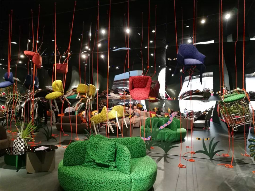 图:展馆正门入口的左侧:森林绿背景墙下包裹着由蓝绿、蓝紫和紫红构成的冷色调家具,营造森林神秘的国度,再以鲜黄色做点缀。