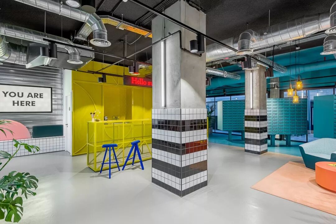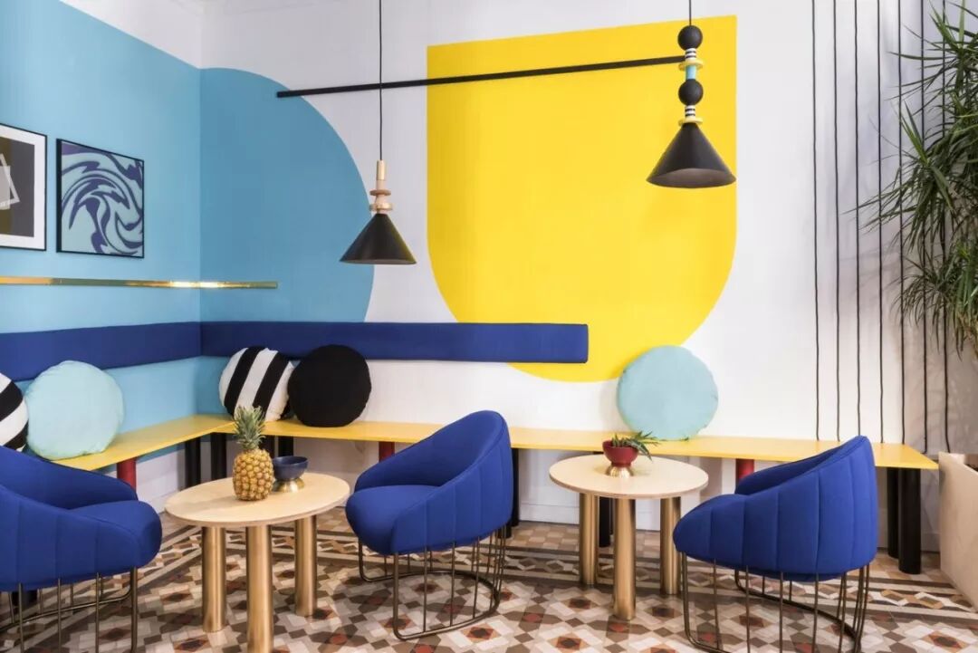 Masquespacio负责为荷兰酒店集团“学生酒店”的两栋楼进行翻新和设计,设计师通过使用当地材料和大胆的色彩来增加地中海特色,并融入酷酷的现代工业风。入口大堂,使用了明快的对比色:黄色区域为接待处,蓝色区域为学生信箱处。公共区域提供了舒适的座椅,供学生交流使用。
