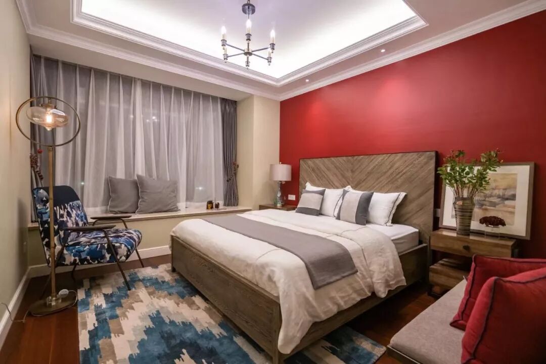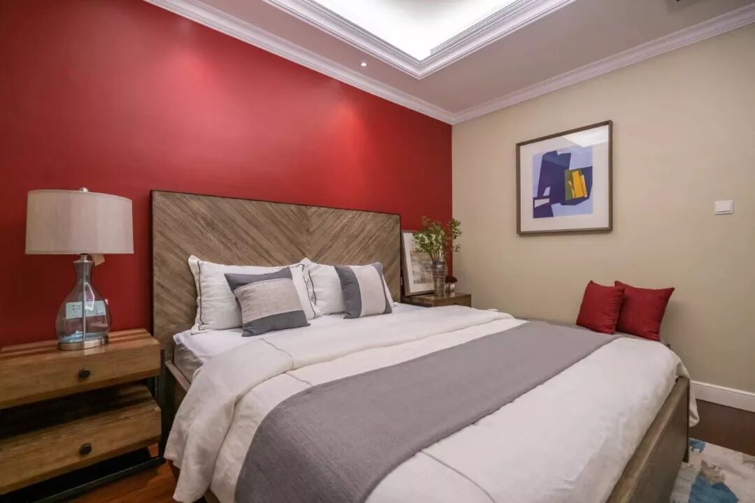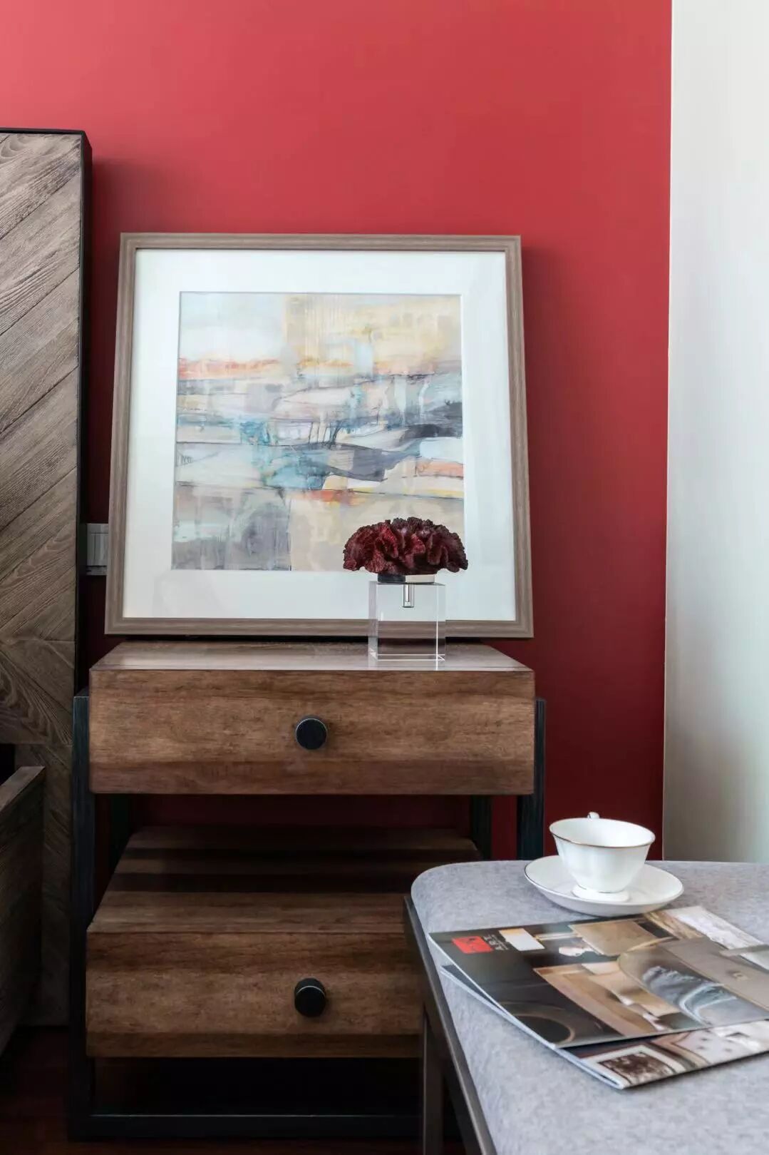 主卧室,太阳红与蓝,空间的张弛度在于物件和色彩给了空间呼吸的可能。红色的背景墙富有张力,家具有自然轻松的灰色系木纹,床尾是稳稳的与之呼应的蓝色系,红蓝之间灰色的窗帘和灰白的床品很自然地呼吸。这种搭配和谐且出彩,软装选择的恰到好处功不可没。