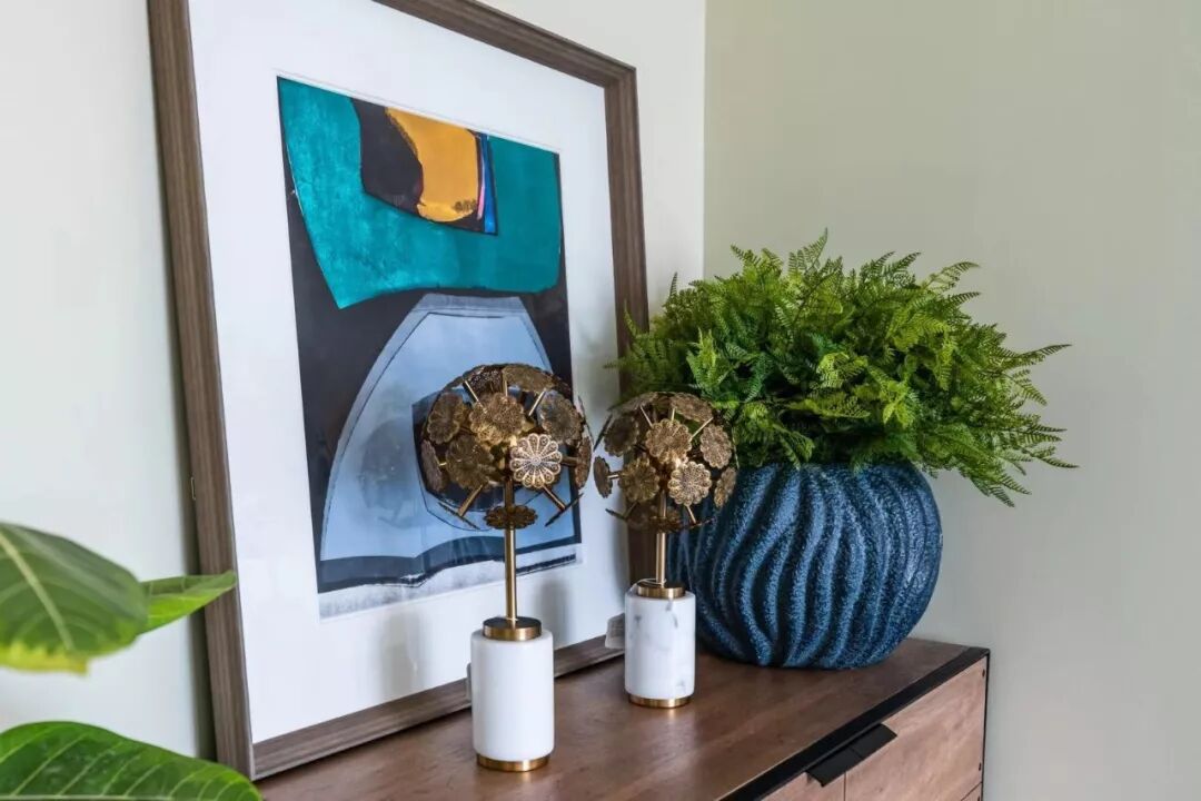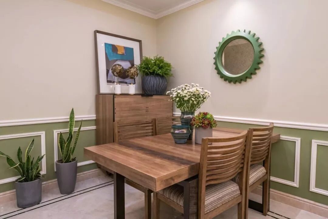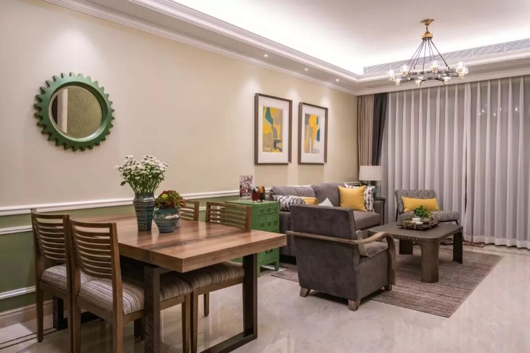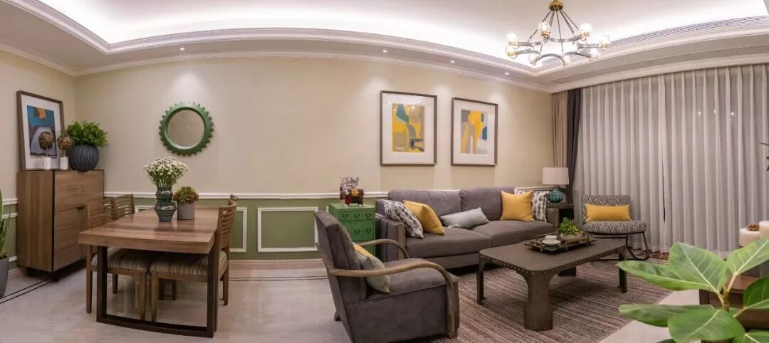 线条和造型,马鞍造型咖啡桌、梯背餐椅、车轮状装饰镜、抽象色块装饰画、细条纹拼色地毯,这些线条和造型在诉说的生活态度是不啰嗦,我们热爱简单的一切。