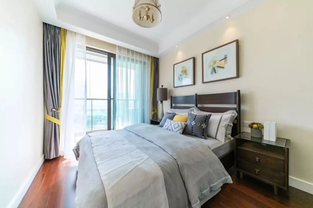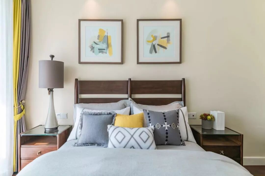次卧室,褐色系的家具在小空间里简单的感觉,通过灰白色的软装装饰,点缀亮黄色的明亮,空间的轻松温馨感觉轻松get。