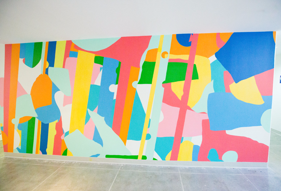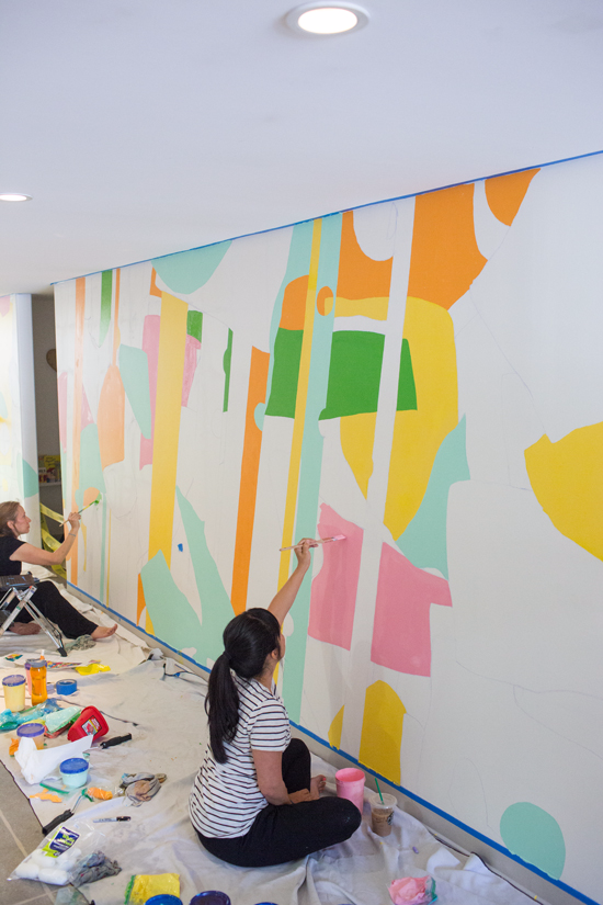 将一幅平面作品实现为一幅巨型壁画,必做的一件事是找对色彩:按着电脑的PANTONE(潘通)色找到本杰明摩尔的涂料颜色。因为两个色彩系统是相同,而且本杰明摩尔的颜色非常充分,因此找色的过程并不艰难。接着就是将比例按1:10来转化,壁画前辈们在现场的墙壁的网格上画出了所有的线条和造型。在这个前提下,整幅壁画从头到尾还是花了整整两周时间。