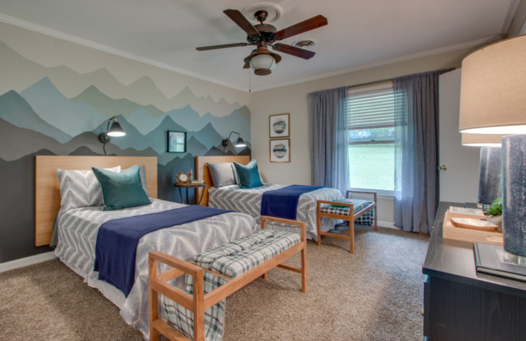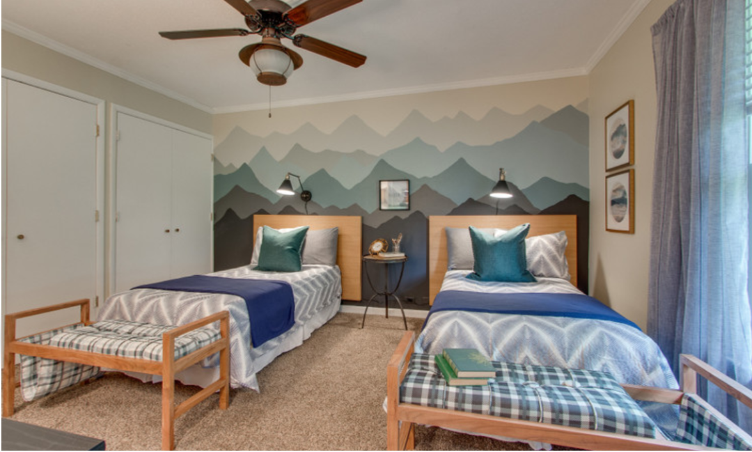 上图:在两个床尾各配上一个与床头板木质色调接近的格子软垫长椅,并铺上带有山脉图案的床品和同色系墙画,配上一个像老式野营灯笼的风扇吊灯,更像是一门艺术。