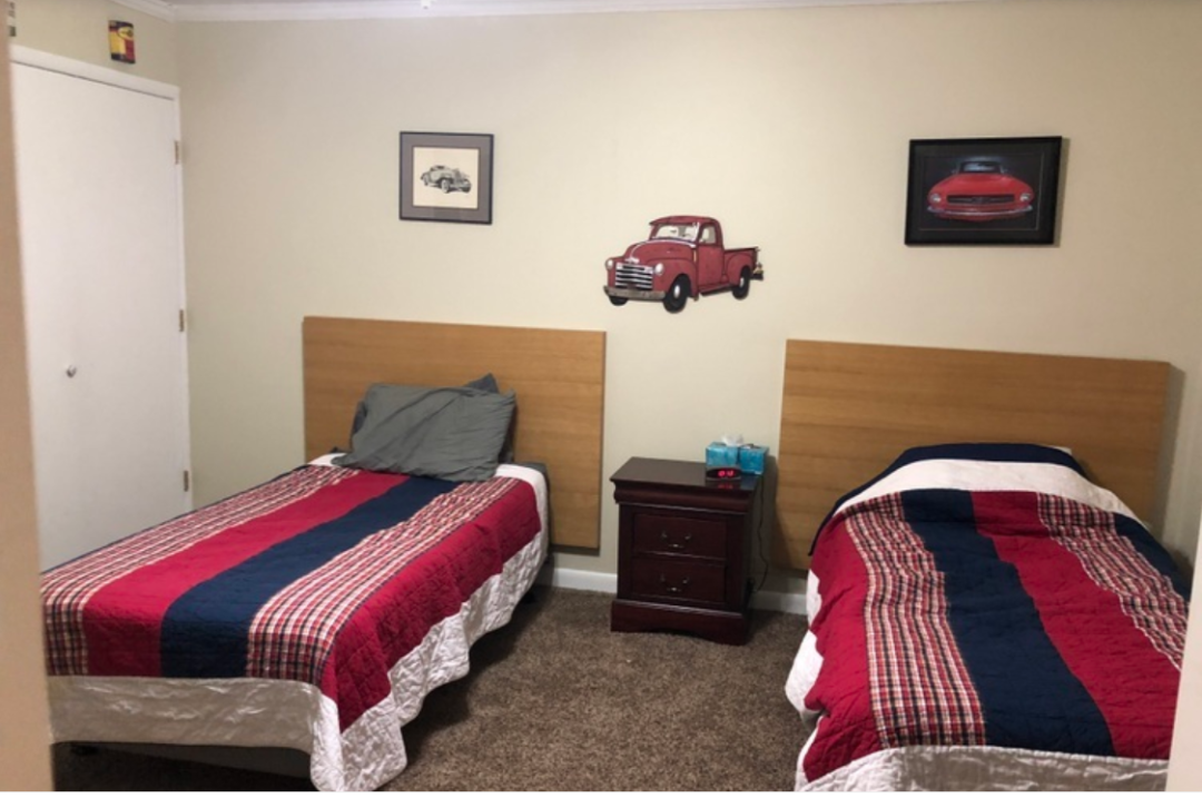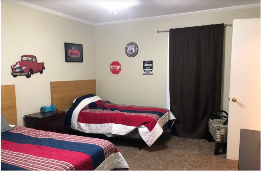 上图:改造前照片,卧室带有一点汽车和旅行的主题,主墙面色为沙黄色。