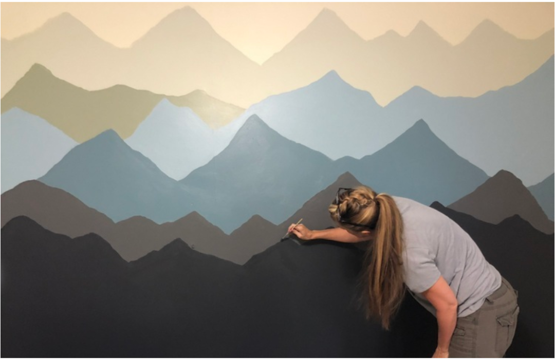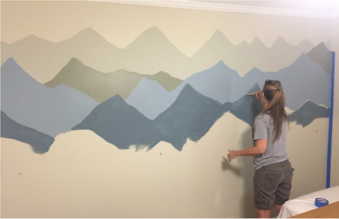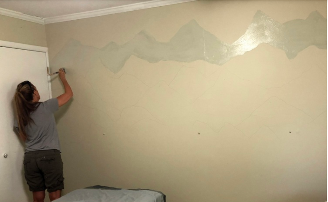 克里斯蒂一再强调自己不是一个艺术画家,虽然整幅画花了她一天的时间(因为一次只能画一种颜色,并且要等第一遍变干后再画第二遍,所以会比较耗时),但是她认为这种绘画非常容易。绘画过程中除了角落部分怕涂料沾到邻近的墙面需要贴美纹纸做间隔,其它部分都不需要任何美纹纸或者胶带。还有一个小TIP就是另外需一个小的艺术用画笔来描绘每个山脉的顶部边缘。